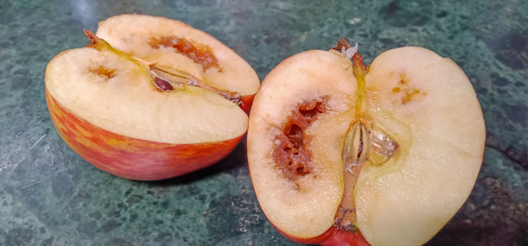 Meandering tunnels in apples, just beneath the skin and extending to the core, are usually the work of apple maggots. Small, rice-like maggots may be present, especially in apples that have dropped to the ground. The larvae move from fallen fruit to the soil to pupate. Adult flies overwinter as pupae about 2 inches (5cm) deep in the soil.